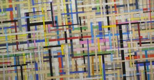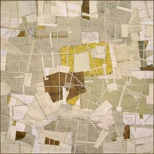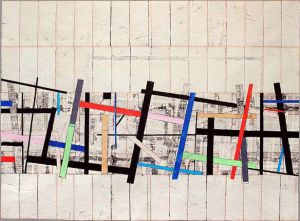 The collage originates from the beginning of the 20th Century. It is now impossible to imagine two-dimensional art without this form of artistic expression up there among the paintings, drawings and prints. It is easy to draw a comparison between this layer-by-layer construction and the time-honoured principles of painting. Paper is to collage what paint is to paintings. Working in reverse is the course also possible. Scratching away, reducing, eliminating the material once it has been assembled. Every Western child has at one time or another had a go at doing this. First colour in a sheet of paper with wax crayon, add another layer of colour on top black for example to hide the ground colour, and then scratch away parts of the black layer with a very sharp tool; you will be amazed at the effect. When this technique is applied to an assembled collage the décollage is born. Resurfacing Works such as High was the Sky and Mauerpark (both from 2008) have not only because of the chosen titles a scenic-geographical undertone. The patchwork of the former has a lot in common with an aerial photograph of an intricate pattern of land parcels and beneath the colourful stripes of Mauerpark a diagrammatic rendering of a park appears to be concealing itself. Another piece like Miles Davis gewidmet (2008) is more abstract and is possibly an allusion, in a style and title, to a famous predecessor: Piet Mondrian, whose Victory Boogie Woogie materialized with the help of adhesive tape. Grigorian affixes and tears away. He foods back edges, overlaps and lays bare. He knows what awaits him below the surface. Perhaps not exactly, but when he conjures up the parts that have lain dormant, it is as he puts it calculated happenstance. Whether it is collage or décollage, Grigorian gets to grips with the matter. Frank van der Ploeg, art historian |